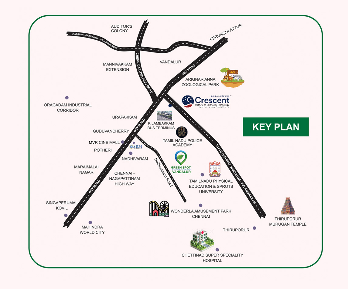 Green Spot Guduvanchery 2.0 offers premium villa plots in Chennai’s fast-growing southern corridor. Strategically located at Guduvanchery, this exclusive community combines peaceful surroundings with excellent connectivity to major infrastructure, educational institutions, and growth hubs.